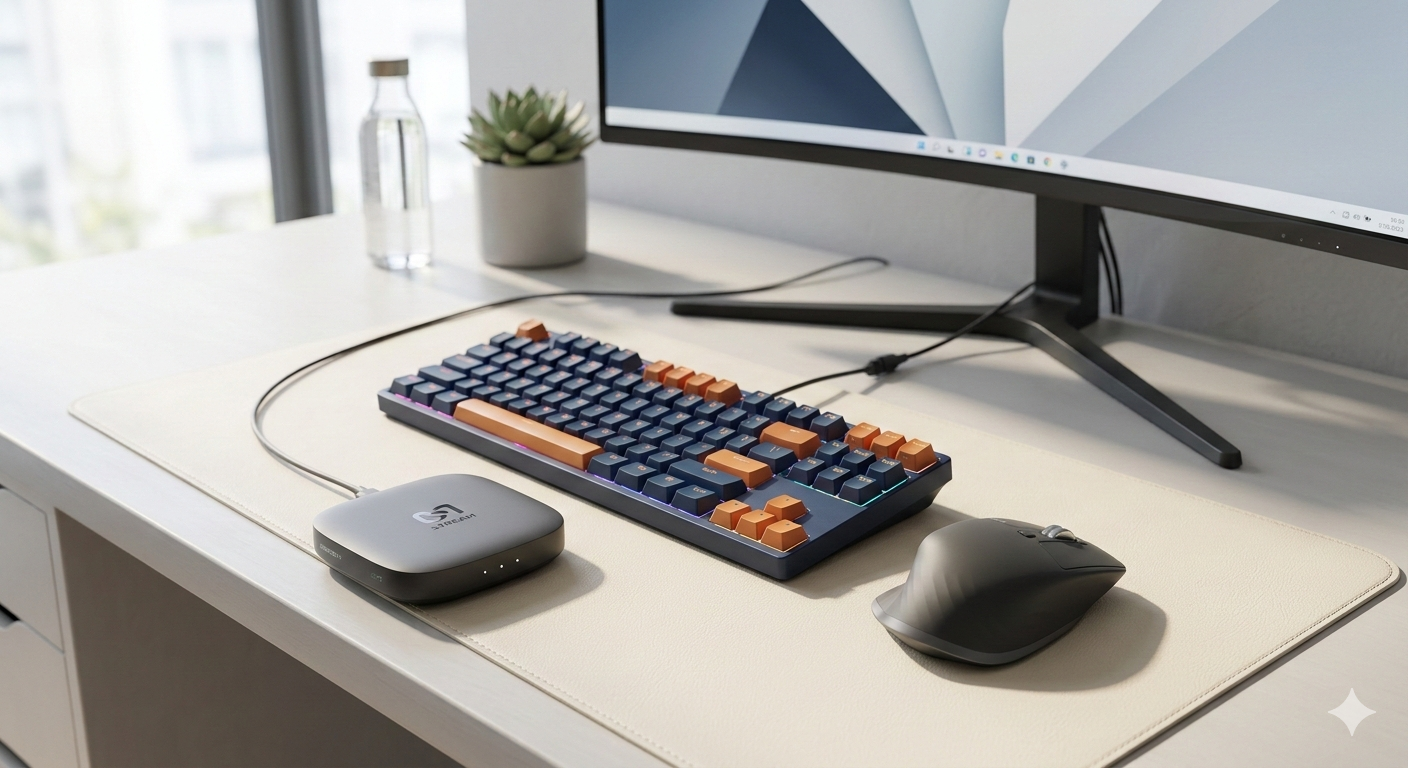 Android TV Box: Desk ke left-central hisse mein ek chhota, compact matte black Android Box rakha hai. Iske corners rounded hain aur is par bohot hi subtle ‘A STREAM’ likha hai. Iske design ko simple aur clean rakha gaya hai taaki yeh minimalist theme ke saath match kare.